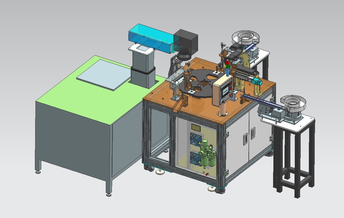 Khi sản phẩm đi qua bộ phận phiễu rung quay li tâm của máy cấp sản phẩm, bộ phận xi lanh sẽ tự động gắp sản phẩm vào những chiếc khay có sẵn. Nhờ được tích hợp công nghệ cảm biến quang nên máy có thể sắp xếp các sản phẩm vào khay với tốc độ gắp nhanh, độ chính xác cao, và liên tục.